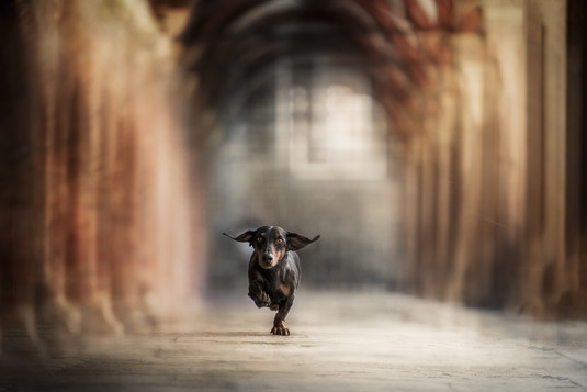 - What a great capture and image. I'm not sure if it's the post production work on this that makes the proportions seem a little confusion, or if the arches are of a smaller dimension, but this running dachshund looks huge in this colonnade. Still, a wonderful and impactful image. ~ illona