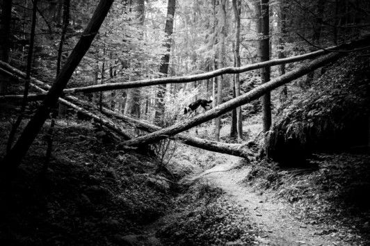 - This is a lovely image, with strong framing and great use of lines with the fallen trees. I do find that the border collie is lost somewhat in the busy forest setting, and wonder if the image had not been converted to black-and-white, if the dog may have stood out a little more. Either way, this is great vision and a wonderful capture. ~ illona