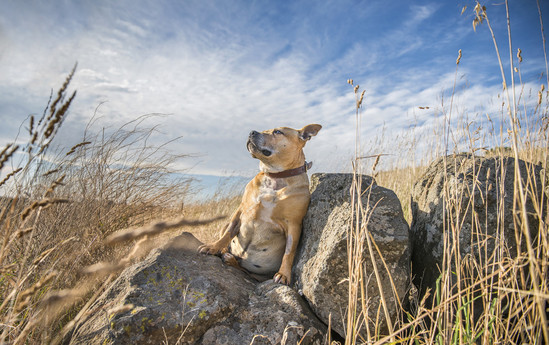 - This image brought an immediate smile to my face ... the way this old dog has just settled back into her perch on the rocks. Gorgeous tones with the blue sky and the warm grasses. The variety of textures - from the clouds to the grasses, the lichen on the rocks and this great dog - give the viewer's eye plenty to take in. Lovely job. ~ illona
