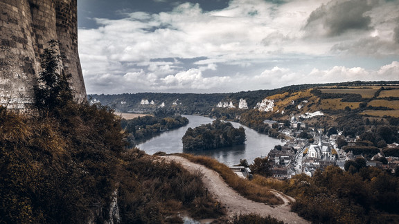 - The creative framing of this image is very successful. Rather than just one subject, the framing allows 3 separate areas to compete for attention – the brick walled building on left, the river island, and the town lower right side. Compositionally this image also works quite well with good harmony and balance between the shapes and the light and dark areas. Interesting, there is even a dark spot in the clouds over the town, one of the lightest parts of the image.