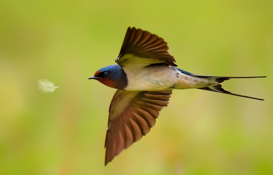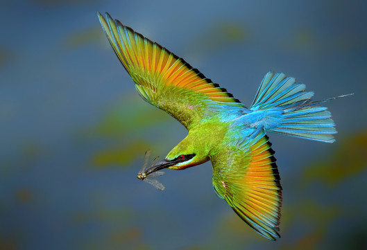 - A vibrant flight shot of a Bee-eater carrying its carefully-oriented prey seen from above against a colour-matched backdrop