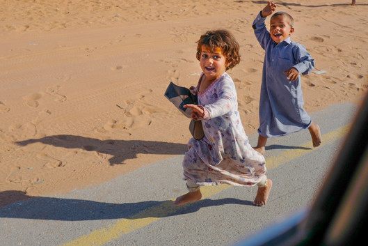 - Taken by John Shingleton, Australian, living in Terrigal , NSW, Australia. Photo taken in Bidiyah, a desert town in central Oman, in December 2018. I were driving through the town in a 4WD when I spotted a group of small children waving to us. I asked the driver to stop so I could take some photos- which were not special. Then as we pulled away I spotted these two small children running after us. I was sitting in the passenger seat beside the driver and luckily my window was still wound down. I did not have time to put my camera to my eye or frame the scene on the LCD so I just held the camera out of the window and hoped. I was using my Leica Q which focused really quickly on the children. The photo was far from straight which I corrected in Lightroom and it is a crop equivalent to about a 46mm lens.