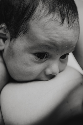 - The most comforting place on earth for this very young person. We just see enough to get the idea of the big picture. This baby is in the best place possible, and the photographer captures this warm feeling well.
