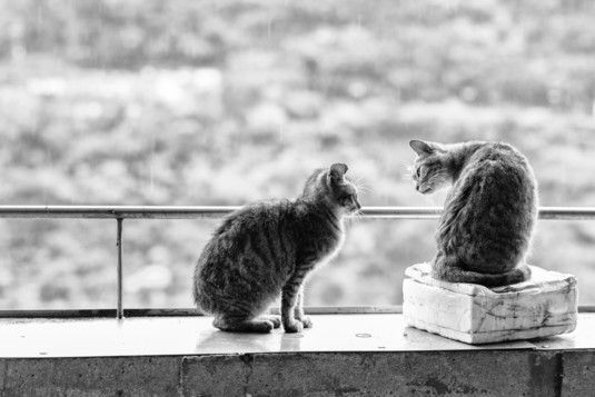 - The varying but subtle elements in this image lead to a very story-telling quality with this photo ... the 'conversation' between these two cats and the rainy day beyond their outdoor perch. Wonderful framing and edit to black-and-white. ~ illona