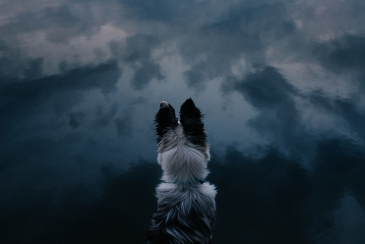 - This is a captivating image in both its dark tones and intriguing setting and angle. The reflected clouds in the water work as a creative backdrop for this dog's extremely fixed attention and alert ears. While I personally find the soft tones compelling, I do feel that the image might benefit from some cleaner whites, especially in the collie, to allow him/her to pop a bit more. Lovely capture and vision. ~ illona