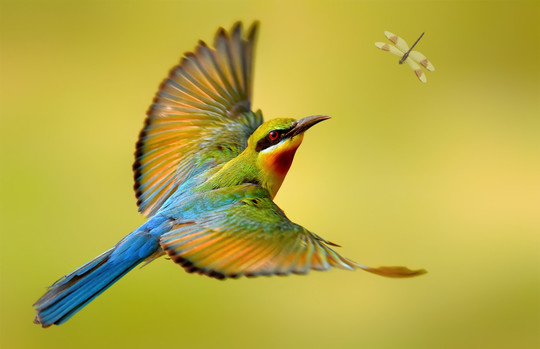 - The Bee-eater's beautiful plumage and dynamic pose have been captured in this flight shot