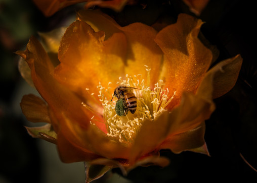 - Intimate and silent, those words coming to mind when looking at the bee in its element. The range of yellow and orange is superb, and so is the light in this photo.