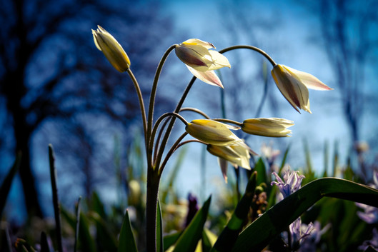 - Here we have a great angle, how the photographer chose to capture these flowers. Because of this particular angle, we can see the dramatic blue sky as a backdrop for these beautiful snowdrop flowers.