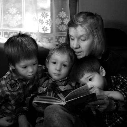 - Family times are the best times for children. This image shows a virarity of different shades and textures. The see-through curtain in the background takes the mind away, hand-in-hand with the story which is being read by the adult. One of these boys seems more interested in the photographer, than in the story!