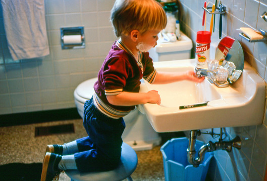 - Being just like daddy, that what comes to mind looking at this lovely image! An intimate glimpse into this boy's life. The colours in this photo are great, and the framing - giving good context of what is going on in this bathroom - and how this young man was captured is superb.