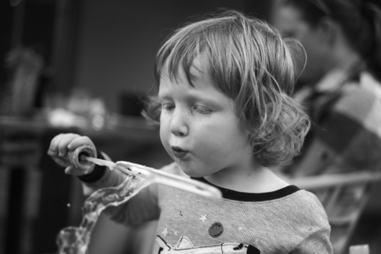 - Bubble blowing is fun, no matter if for young or for older people. We see anticipation in this child’s face, and the depths of field in this image is well chosen. It draws the observer to the expressing of the kid, and makes what’s behind less important.