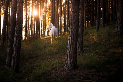 - This image was an instant fave ... the dark forest setting allows the white horse to stand out ... the setting (or rising) sun casting long shadows and making the forest glow, give us a sense of being right there with this quiet horse. Nicely captured and edited. Congrats! ~ illona