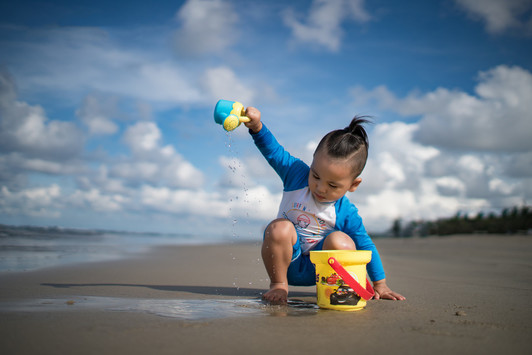 - The combination of blue and yellow works really well in this photo. Seems that the focal point is on the water drops, which is superb! What gorgeous beach this is, so much freedom all around! We also like that the photographer went down to the eye level of this child. A stunning photograph this is!
