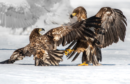 - Dynamic poses and strong eye contact elevate this capture of grappling eagles on ice