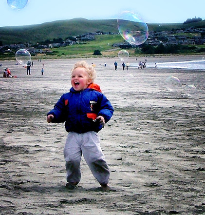 - The excitement of this little person is contagious and makes us excited as well! Having so much space around him (or her) makes this person stand out from the rest of the surrounding. No matter how cold it was, when this photo was taken. There is a lot of warmth in it, being communicated through the child’s happiness. The rainbow colours, showing in the bubbles, are nice details in this image.
