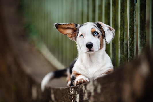 - Oh my, what a fabulous image of this darling pup, his stunning eyes, and his ear standing sideways. The setting and the lines surrounding him are a perfect setting for him and his attentive stare. Nicely done. ~illona