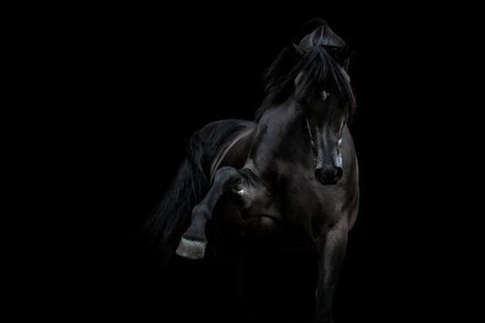 - What a perfect capture of a magnificent horse ... the tuck of his head accentuating the strong neck, the sweep of his tail, and of course, the raised leg create a truly memorable image. The black-on-black treatment of this image makes it even more striking. Well done! ~ illona