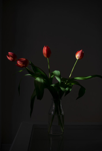 - Delicate and sensibly executed, these not fully opened-up tulips were captured. The spare light in this dark environment gives it a theatrical appearance.