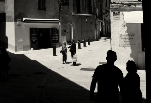 - My name is Aldo Ruotolo, I am Italian. I'm honored and very excited to be the winner of this round! This picture was taken with an Olympus Pen PL-1 in Bonifacio (France). It was about lunch time and I was trying to take pictures with persons in silhouette taking advantage of the high contrast created by sun over the head. Two people started talking in the middle of the street and other two arrived in the shadow, stopping and looking at them. This is when I shot it! Thank you very much!