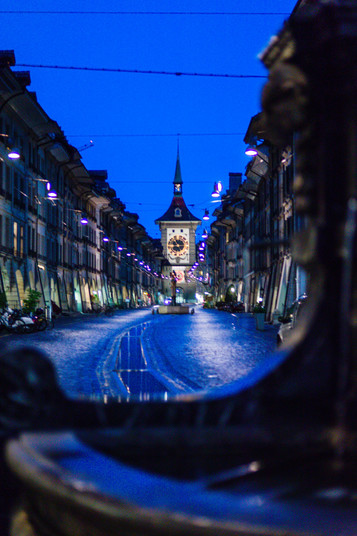 - Blue Hour in Kramgasse, Old Center of Berne, Switzerland, with Astronomical Clocktower "Zytglogge". Nightrise on a Rainy Evening during Corona Lockdown, April 2020