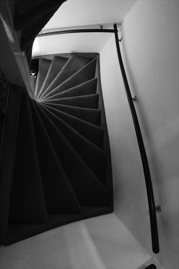 - What a fabulous image and capture. The incredible lines of this image are only accentuated by the decision to convert it to black and white, allowing the viewer's eye to travel down the stairs to and the black and white cat, gazing up to stare directly at the camera. Nicely done. ~ illona