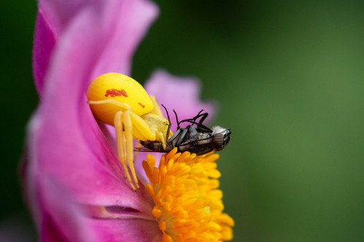 - Amazing photo with the complimentary coloured and feasting yellow crab spider and anemone. A beautiful setting for dinner indeed.