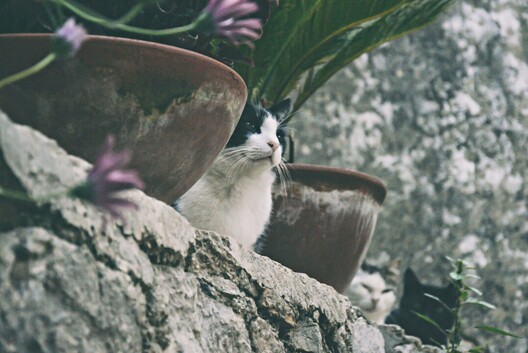 - While I'm personally not a fan of the washed-out approach to editing, this is a lovely capture. The contrast of textures - from the mineral-stained pots to the rough stone wall, the delicate flowers and the cats - is lovely, and the calmness of the cats and the image overall is conveyed to the viewer. Nicely captured.