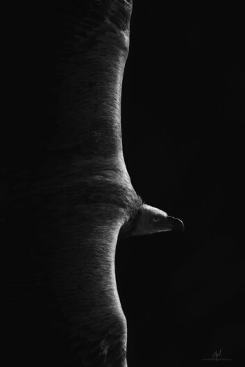 - The factors that make a bird image stand out can relate to the avian subjects themselves or to the photographic techniques used (or a combination of the two). In this case, although the vulture is obviously an impressive individual, it's clearly the art of the photographer that has elevated this flight shot into such a striking image. The use of a monochrome presentation is the most obvious choice made and this was a good decision well executed, with a great range of tones modelling the subject. Compositionally, the vertical boundary splitting the frame into half bird, half background is very powerful, with the protruding head adding perfect punctuation and the lightened eye providing a strong focal point. An arresting and appealing image.