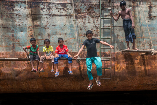 - 'Who is the bravest', could be the title of this image. The backdrop looks full of patina, maybe this is an old and weathered ship? The children enjoying themselves with smiles in their face. Lovely and filled with colours, enjoying their day.
