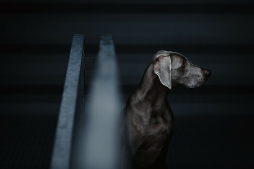 - Gosh, what a lovely image ... the subtle, cool tones, the depth of shadows, and the incredible lines and form of this Weimaraner, all work together to create a memorable image. I do feel that the image would be even stronger if it were framed in a way to give more space on the right, where the two receding lines of steel were at the far left of the frame, giving the dog more space to gaze into. As it is, the space on the right feels uncomfortably tight. Wonderful capture.
