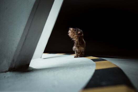 - This is a wonderful image ... the simplicity of elements, the curved leading line to the dog, the dog's uplifted gaze into the light, his scruffiness contrasting the stark and smooth lines of the setting ... all work together to make this an immediately favorite image. My only criticism of the image is the framing. I do feel that we need more 'breathing room' to the left of frame, and less dead space on the right and bottom. I think this could be accomplished while still retaining that lovely curved leading line. But an overall lovely image. Nicely done.