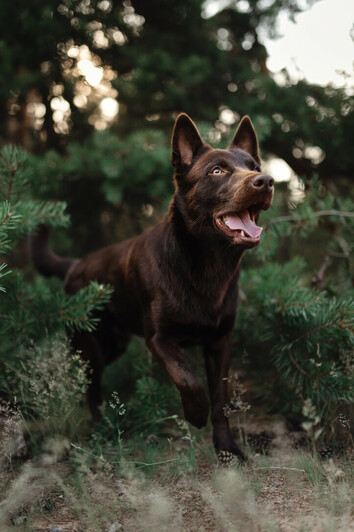 - This is a great image ... the low angle, the wonderful depth of colors with the brown against rich greens, and the action captured of the dog emerging from the brush, make it unique. Nicely captured.