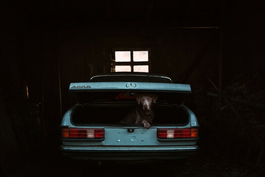 - This is such a fabulous and moody image. The deep shadows giving only a glimpse of the farther reaches of the garage, the limited and dreamy color palette of the old mercedes with its old lights, and then the perfectly lit Weim emerging from the trunk ... all make this an instantly intriguing and memorable image. Nicely done! And congrats!