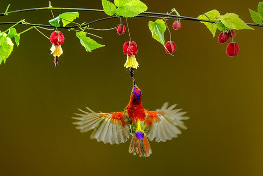 - Despite the abundance of hummingbird-type images out there, this one has lasting appeal for me for two reasons. First, despite breaking one of the strongest rules of thumb in bird photography, namely never to photograph birds facing away from you, this shot illustrates how all rules can be broken in a good way. The great shape of the bird as it flies upward into the frame gives the image a strong focal point. The most compelling feature of the image though is the way such vivid colours - red, green, yellow and purple - are repeated across and down the frame. My favourite is the repetition of the red and yellow of the flower in the plumage of the bird's back. I could easily imagine a print of this image brightening up a room.