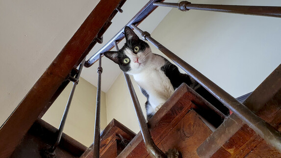 - This is a fabulous and fun image of this black and white cat peering down the staircase. The angle is wildly perfect, and the contrast of varying textures - the old wood, the iron balusters, and then the detail of the cat's fur and whiskers - keep this image rich, with lots to look at for the viewer. Nicely done Congratulations!