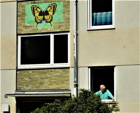 - What seems to be in the midst of a concrete jungle, a bit of hope. The painted butterfly goes perfectly in harmony with the green shirt that person is wearing. A lovely image, well composed.