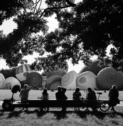 - I love street photography, that why my camera always with me. I, with my daughter, walking in Vingis park in Vilnius, Lithuania, there, during the summer, hot air balloons rise every day. People gathers to watch the event, this spectacle always fascinates all. I found the most suitable angle from which I could see the balloons rising and the people watching them. A massive bench helps to express the separation between the people on the ground and the balloons rising. The trees growing around helped a lot to perfectly frame the whole shot, a massive bench helps to express the separation between the people on the ground and the balloons rising. People's gestures speak for themselves. Shot taken with medium format camera ARAX MC, lens Arsat 80/2.8, film Ilford PAN F 50 The camera isn't the best for street photography, but it was perfect for this shot.