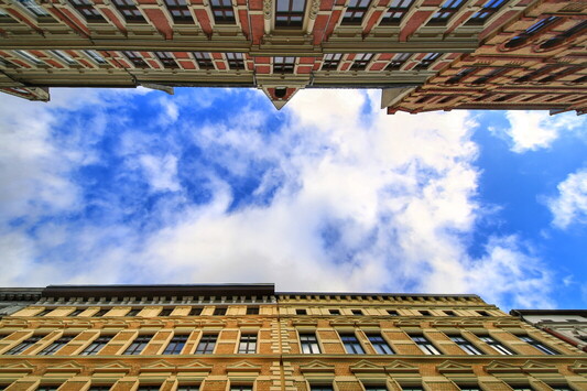 - Thanks for your votes! This is an extreme wide angle upward view of landmarked buildings in the Heidestrasse in Magdeburg. I used my Canon EOS 6D with an Irix 11 mm lens at f/8.0.