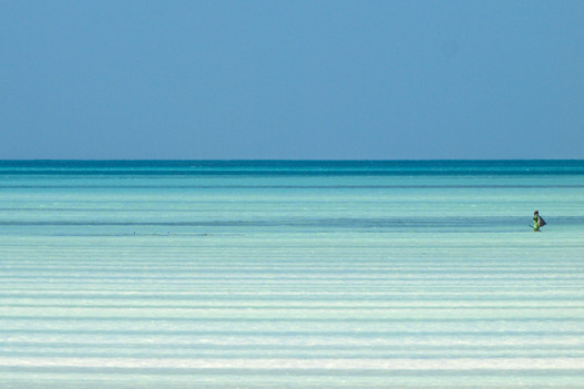 This looks like seaweed farming in Indonesia. It is a lovely shot, well done. I love the lines from the seaweed plantation and the colour of the water. The woman in green fits in so well at the edge against the darker patch of sea. Nice and refreshing ☺