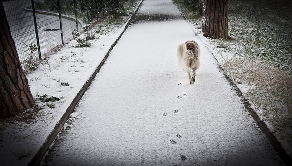 - wow, i love this SO many ways. beautiful tones and light, and great use of vignetting. the angled lines of the walkway along with the dog's prints lead us into and through the image. well done. definitely a memorable image. it was a very very tough call for first place. ~illona