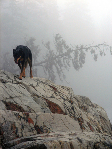 - My name is Holly Garner-Jackson and this was my dobie/shepherd mix Maggie Muggins. I shot this with a Sony Cybershot1 along the coast of Lubec, Maine. It was one of those surreal foggy days and I just glanced up to see Maggie cruising the ledge along the shore and took the shot. It is one of my all time favorite shots of Maggie. I call it "The Inner Wolf"