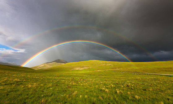 - <p>Stormy weather and shifting light have made this work. This is a photograph that can’t be planned in advance, infact it could easily have been missed altogether. We have all witnessed fleeting scenes like this and the frustration of not having a camera ready at hand. Here the photographer was there and ready, with camera, when the critical moment came. The pressure was on! The exposure is spot on, the depth of field too, and the composition is strong, capturing one of nature’s amazing displays with not one, but two rainbows... before it all disappeared.</p> <p>I love the dark sky and bright sunny spell which give this image it’s power, but also the way the grass seems to lean forwards into the picture, inviting us to wander beneath the rainbows. A beautiful fairy tale photo which almost made the top spot. Well done!</p>