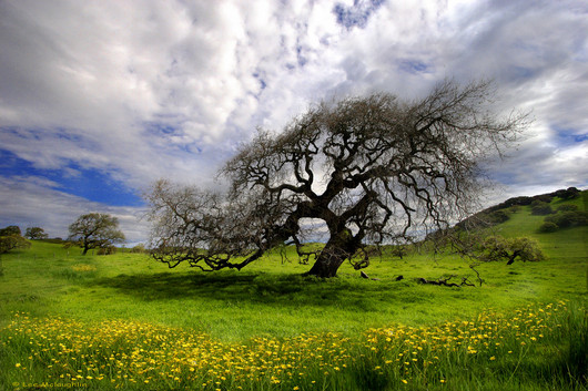 - This looks like a doctored photograph made up of two separate files, (please correct me if I am wrong) but it has been very tastefully done with the crown of flowers honouring this amazing tortured tree. The harsh, contrasted light gives strength to the ground and bounces nicely with the softer tones of the sky. The frame is bold, the tree in the center, a technique which is sometimes difficult, but has worked well here. It is an interesting subject and you have done well finding it, the two distant trees adding to the composition. Maybe a softer, more subtle post processing would have been better here but I admire your approach. Well done!
