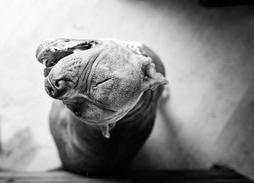 - great capture. the "upside-downedness" of this image makes it unique, and the sentiment it evokes with the closed eyes and opened mouth greeting are lovely. well done, and beautiful b&w conversion as well! ~ illona
