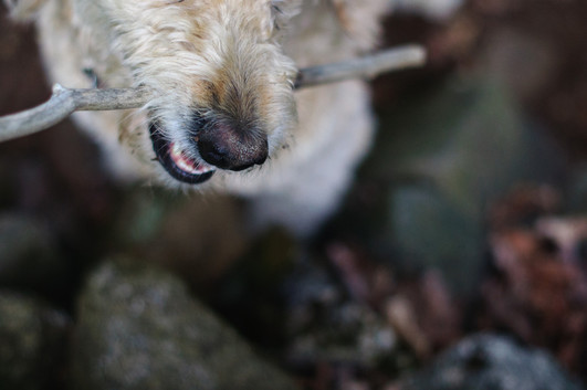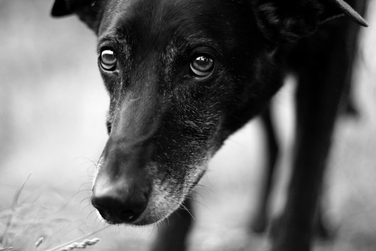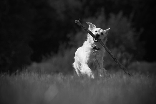 - this image is made even more striking by its expert b&w conversion. what we also see here is what happens a lot in pet photography -- a combination of skill and luck. for instance, the framing of the retriever by the lighter bush behind it, the angle if the stick following the angle of the ear ... it's not as though we pet photogs can set these things up ... BUT with skill we can align the elements as best possible to make it possible for this kind of capture and THEN we need to have the skill to actually SEE these elements in post and choose the right images. in this case, the right image was chosen. and by converting to b&w, these elements -- the echoed angle of stick and ear, the bush behind framing the retriever -- are really accentuated. well done on a truly rich image. ~ illona