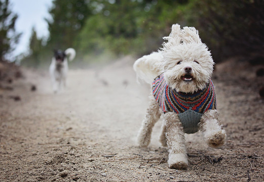 - i like it. i just do. i wish it had been uploaded larger so that i could see more details, but i love the 'dogginess' of this image ... a white froo dog in his sweater out there on the trails, raising some dust. well captured! ~ illona