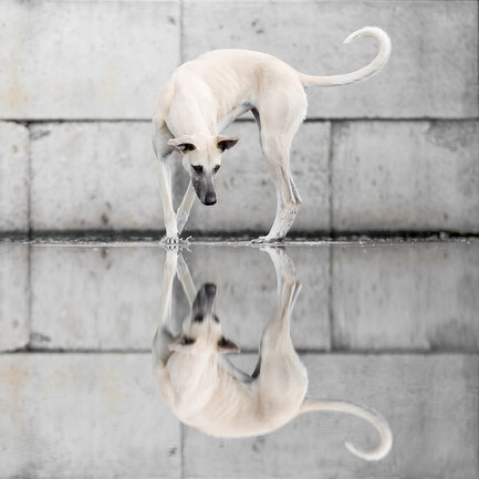 - Thank you very much for choosing my picture. It shows my lovely Scout. The puddle my dog stands in is only a centimeter deep so the water surface is immediately calm again. It took several shots to get the picture I wanted. This photo is not photoshopped, the reflection is real. My name is Elke Vogelsang.