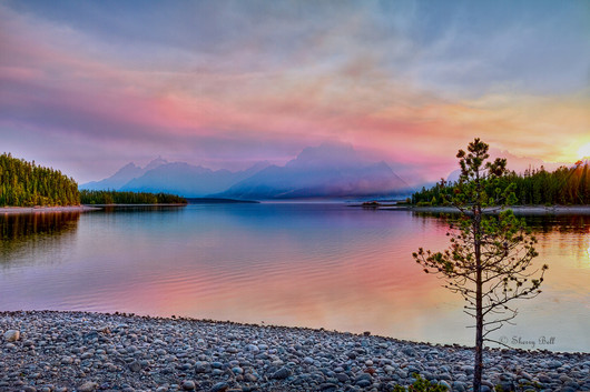 - Thank you each for the support. My Name is Sherry Bell, Teton NP, I wanted to capture the Tetons reflecting in Jackson Lake at sunset. Disappointment, the skies were smoke filled a fire was burning 200 miles away. Walked the long walk to the point I wanted to shoot from and hoped the cool evening air would bring the smoke down to the ground. I waited and then the smoky sky started to take on colors growing more intense the lower the sun went. Canon 7D, 17-40mm Lens, GND filter,