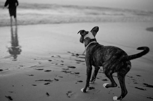 - what a fun and engaging image. the b&w conversion is skillful, and in this case reduces the photo to its key elements, the beach, surf, the owner, and the advancing puppy with its swinging tail. the composition of these elements truly stands out when presented in this conversion. well done! ~ illona