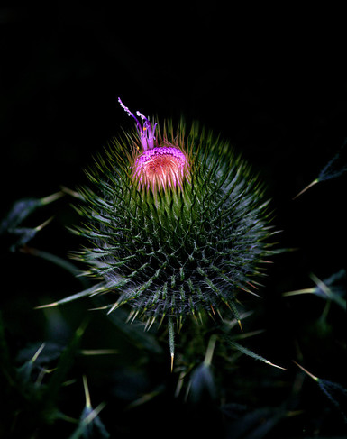 - Thank you! This photo is of a thistle I let grow in my garden in Hertfordshire. Leaving for work very early one summer morning I noticed the first flower opening and this unusual and seldom seen moment I shot with my Canon 500d and 55-250mm zoom lens and at f9 probably.